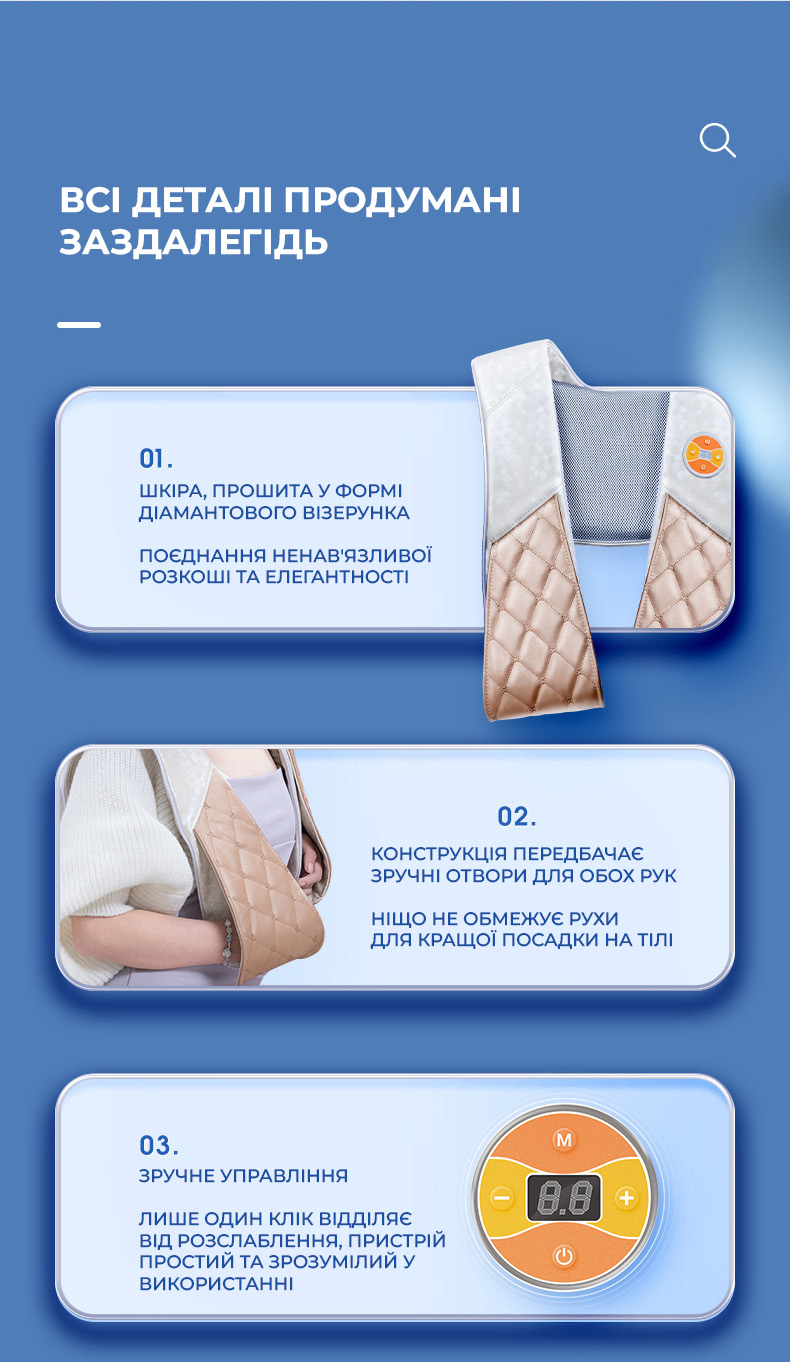 Массажер изготовлен из высококачественных материалов, обеспечивающих приятные тактильные ощущения и долговечность. Мягкая и дышащая ткань делает процесс массажа еще более удобным.