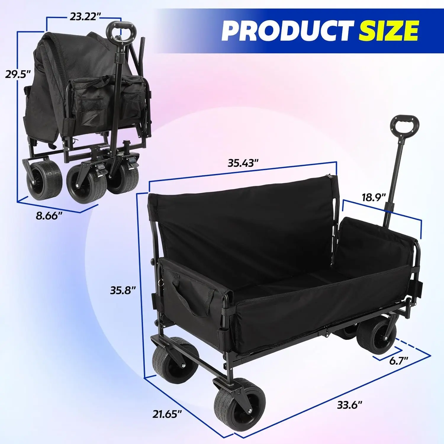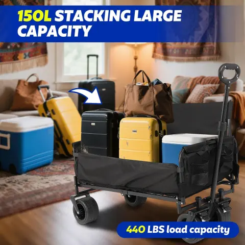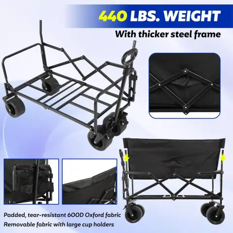 Наш складной фургон имеет прочную раму из утолщенной углеродистой стали с грузоподъемностью до 440 фунтов, а ткань изготовлена из утолщенной двухслойной ткани Oxford 600D, которая является водонепроницаемой и износостойкой. Независимо от того, перевозите ли вы продукты, снаряжение или садовые принадлежности, эта 4-колесная тележка легко справится с трудными задачами.