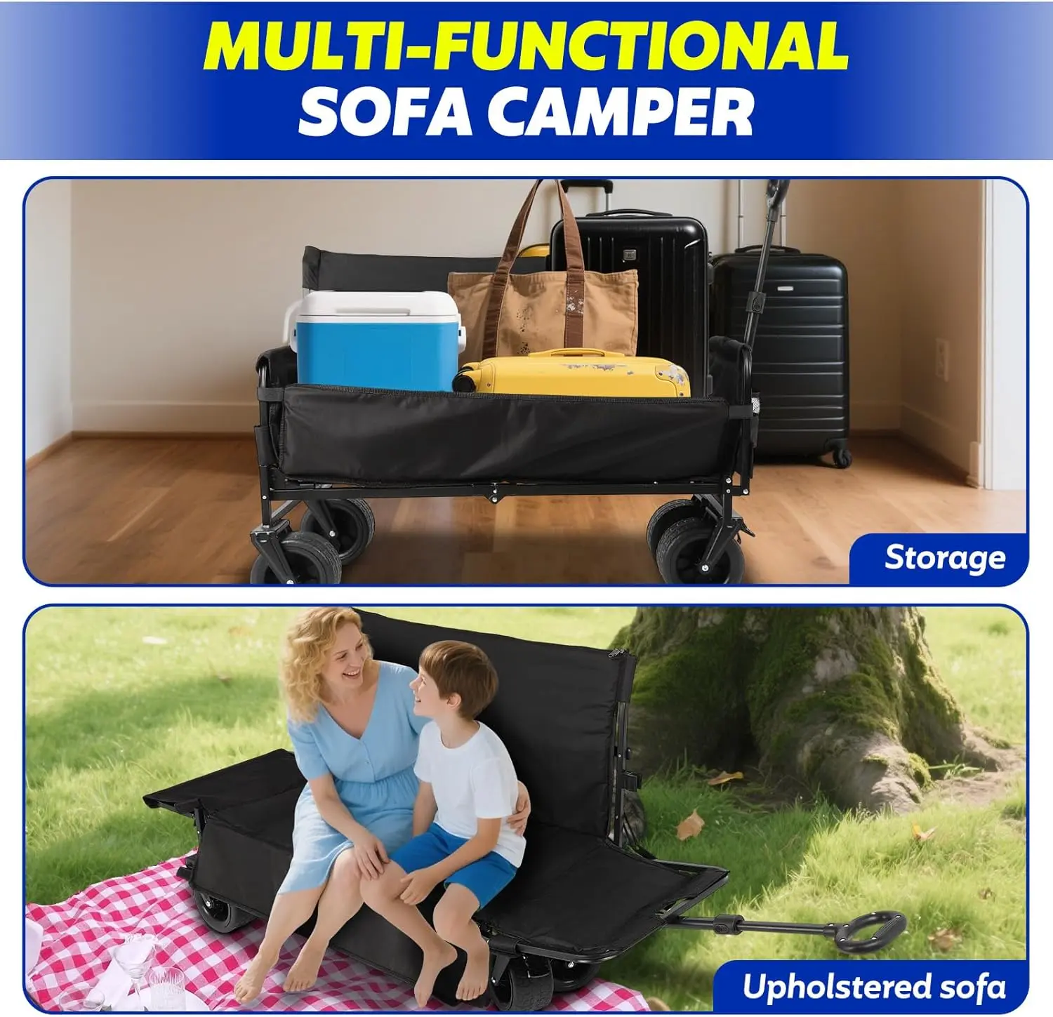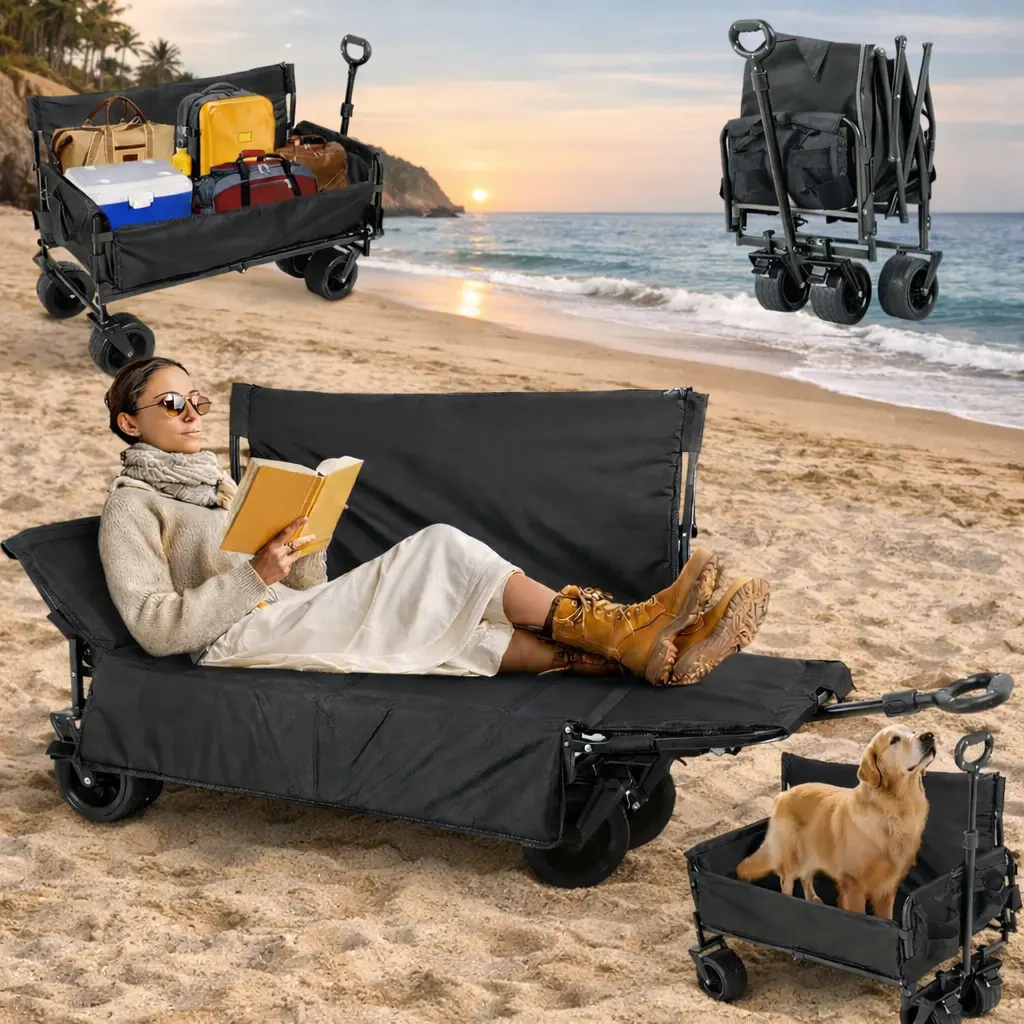 Эта складная тележка на колесах идеально подходит для перевозки туристического снаряжения и мгновенно превращается в удобный диван! Конструкция с боковым открыванием и подушками из высокоэластической пены позволяет этой пляжной тележке быстро раскладываться в диван длиной 54 дюйма, на котором можно откинуться назад. Независимо от того, отдыхаете ли вы в кемпинге, забираете свои вещи, устраиваете семейное мероприятие, выгуливаете домашних животных и т.д., она идеально подходит для кемпинга без необходимости возить дополнительное снаряжение для хранения, экономя вашу энергию и место.