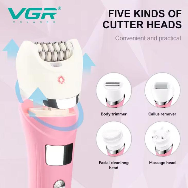 Откройте многофункциональный женский прибор 5 в 1 VGR V-759 – идеальное решение для ухода за собой дома и в поездке. Эпиляция, бритье, пилинг, массаж и уход за пятками – все в одном компактном устройстве!