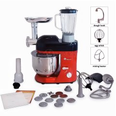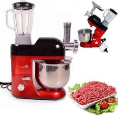 Насадки: мясорубка с 3-мя насадками для фарша(насадки для колбас и кеббе), блендер, тестомес, миксер