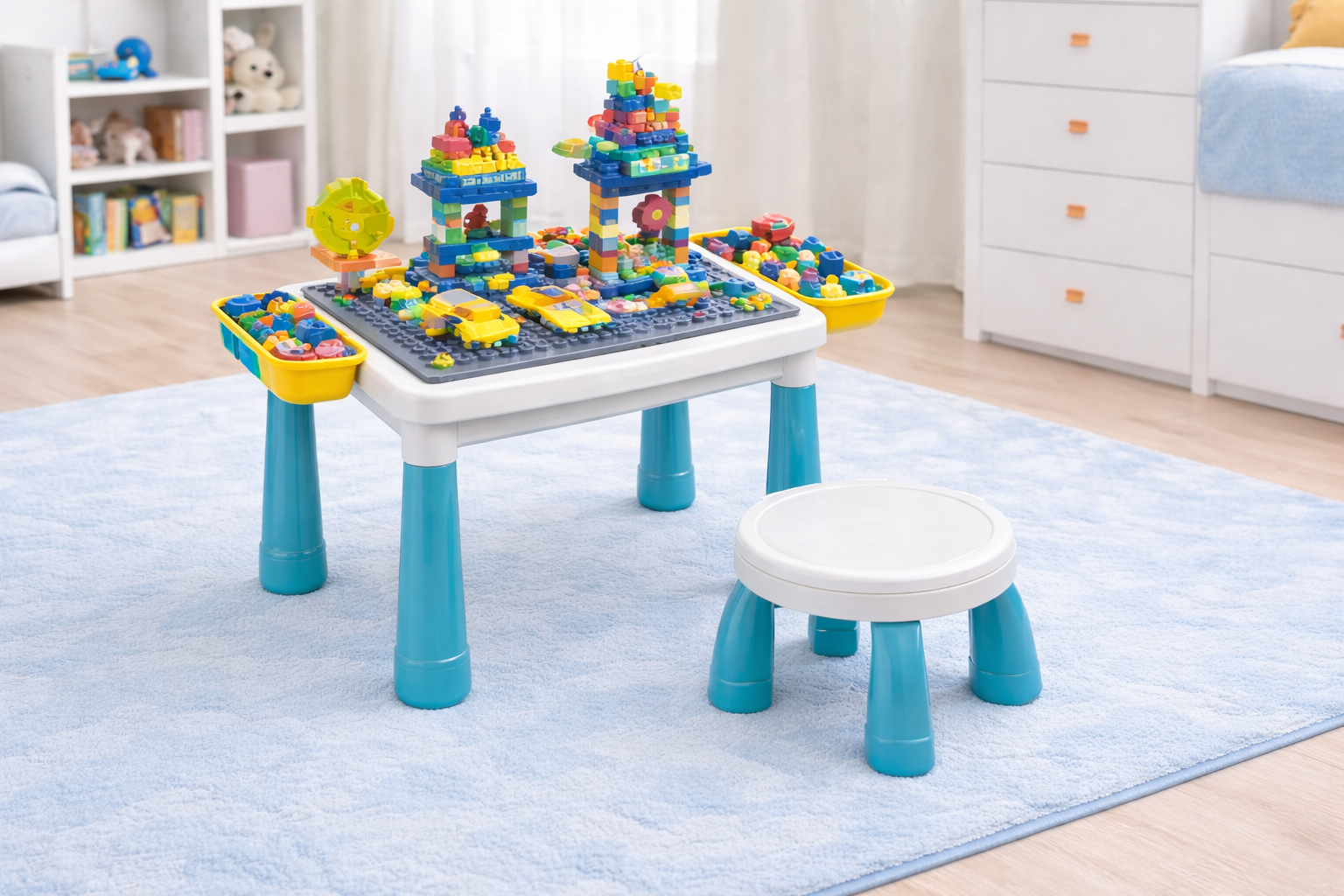 Столик имеет боковые ящики для хранения конструктора и художественных принадлежностей, которые помогают поддерживать порядок и чистоту в комнате.