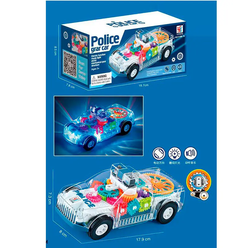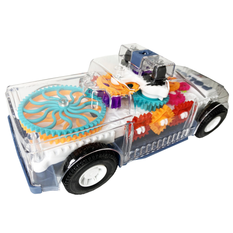 Прозрачная светящаяся машинка с музыкой удивит ребёнка своим необычным строением, позволяющим наблюдать за движением шестеренок внутри.