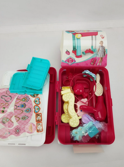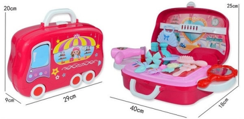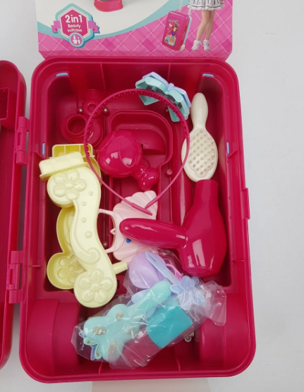 В комплект входят: чемоданчик; столик с полочками; фен; душ; 2 помадки; коробочка; расчёска; зеркальце; гребень; 2 флакончика духов; заколочка.