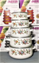 Набор состоит из пяти кастрюль, изготовленных из нержавеющей стали толщиной 2 мм, которые покрыты тремя слоями эмалированного покрытия. Стеклянная термостойкая крышка куполообразной формы для правильной циркуляции горячего воздуха внутри кастрюли.