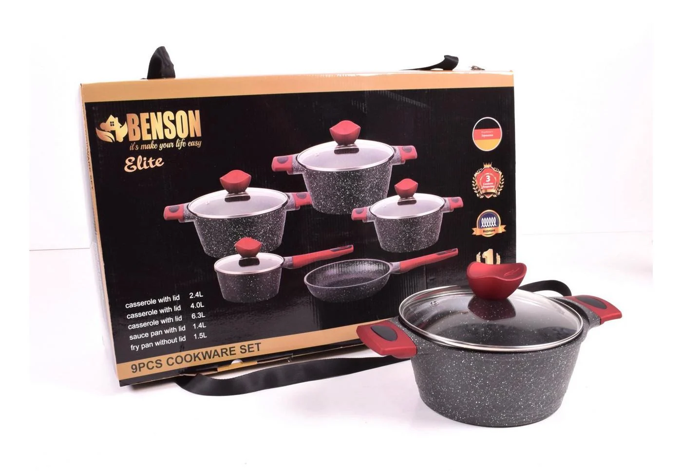 Набор посуды Benson состоит из 9 предметов. Изделия выполнены из литого алюминия с мармуровым антипригарным покрытием, устойчивым к подряпинам. Кроме того, такое покрытие позволяет готовить здоровую пищу с минимальным добавлением жира или масла, легко моющегося. Крышки изготовлены из термостойкого стекла и оснащены отверстием для выхода пара. Такая крышка позволяет следить за процессом приготовления пищи без потери тепла. Она плотно прилегает к краю кастрюлы, сохраняя аромат блюд.