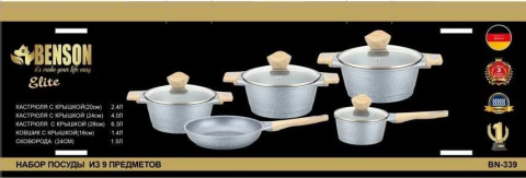 Набор посуды Benson состоит из 9 предметов. Изделия выполнены из литого алюминия с мармуровым антипригарным покрытием, устойчивым к подряпинам. Кроме того, такое покрытие позволяет готовить здоровую пищу с минимальным добавлением жира или масла, легко моющегося. Крышки изготовлены из термостойкого стекла и оснащены отверстием для выхода пара. Такая крышка позволяет следить за процессом приготовления пищи без потери тепла. Она плотно прилегает к краю кастрюлы, сохраняя аромат блюд.