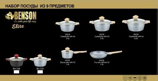 Набор кастрюль BN-339, 9 предметов, ковшик 1,4 л; 2,4л; 4л; 6,3л; сковорода 24см