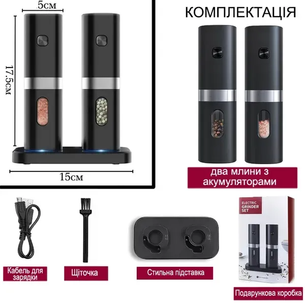 Это стильный и современный набор электрических мельниц для специй, сочетающий функциональность, эстетику и удобство. Подходит для соли, перца, сушеных специй.