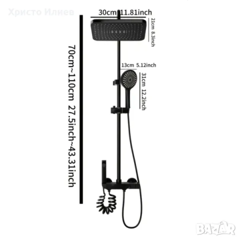 высота душевой стойки – 1050 мм с максимальным углом поворота до 70°;