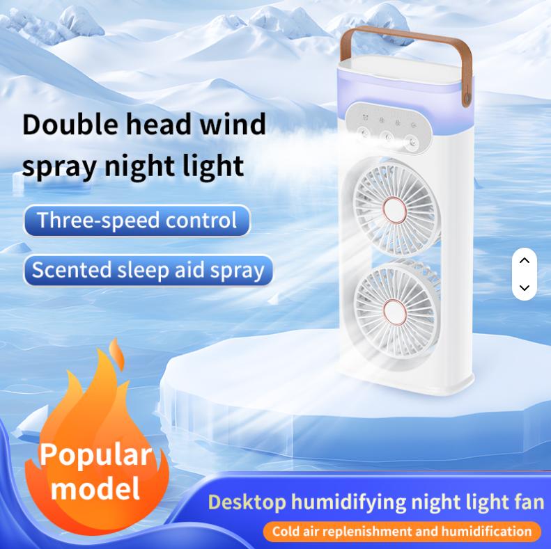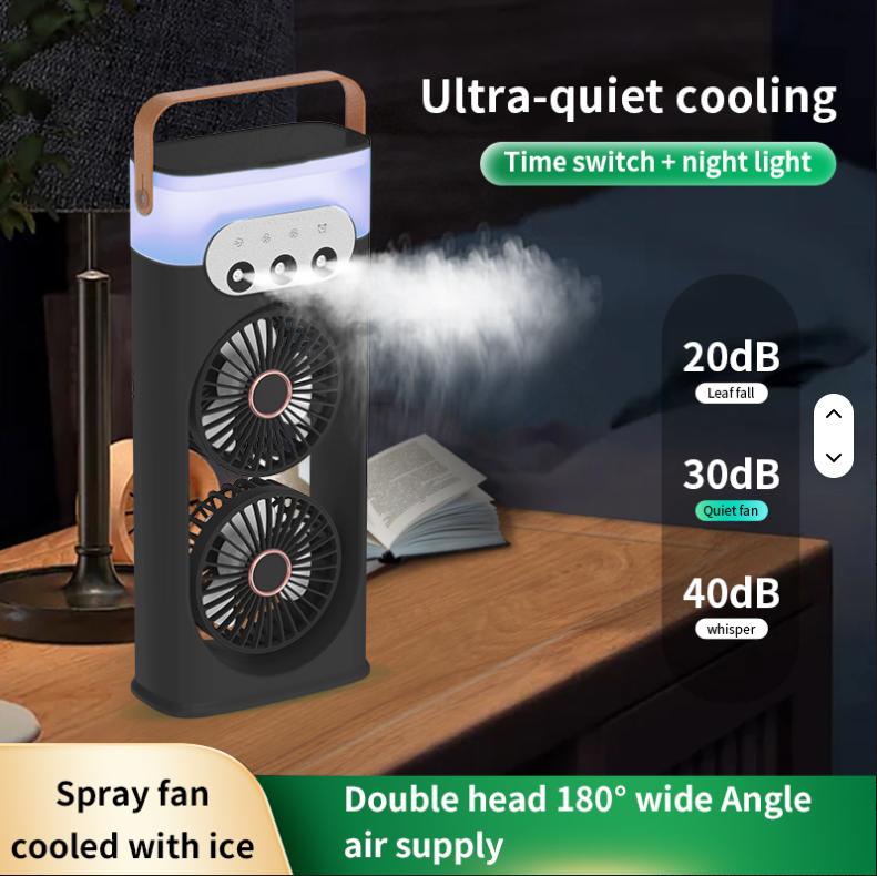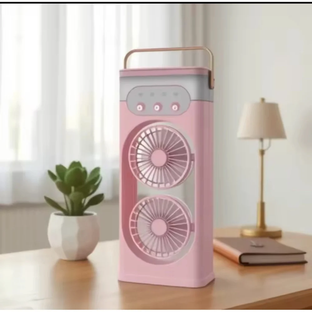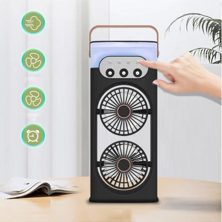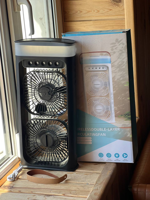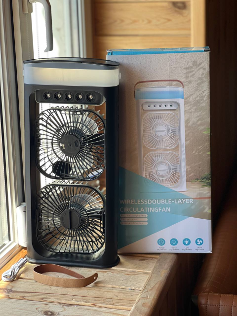 Портативный двойной вентилятор-кондиционер с яркой LED подсветкой и функцией распыления водяного тумана обеспечивает эффективное охлаждение в любых условиях.