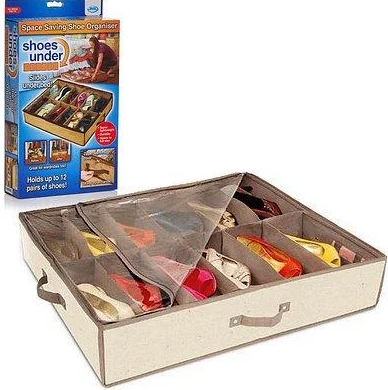 Почему стоит органайзер для обуви купить? Shoes Under поможет избавиться вам от вечной проблемы с хранением обуви, постоянным поиском пары к туфле или ботинку, а также защитит ваши сапоги, босоножки и тапочки от пыли и лишней влаги. Такая вещь легко поместиться под кровать или в обычном шкафу. Она легкая, так как изготовлена из прочной ткани, быстро чиститься простой щеточкой и практически не занимает никакого места, когда в ней нет обуви.
