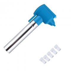 Набор имеет размер 245 на 145 мм и весит около 100 грамм. В него входят сам электронный прибор и 5 полирующих насадок. На лицевой стороне отбеливающего устройства находится фонарь и специальный разъем для крепления насадок. Полирующие насадки выполнены в форме чашечек из мягкой резины. Насадки идентичны и меняются по ходу их износа. 5 насадок хватит примерно на 500 процедур отбеливания.