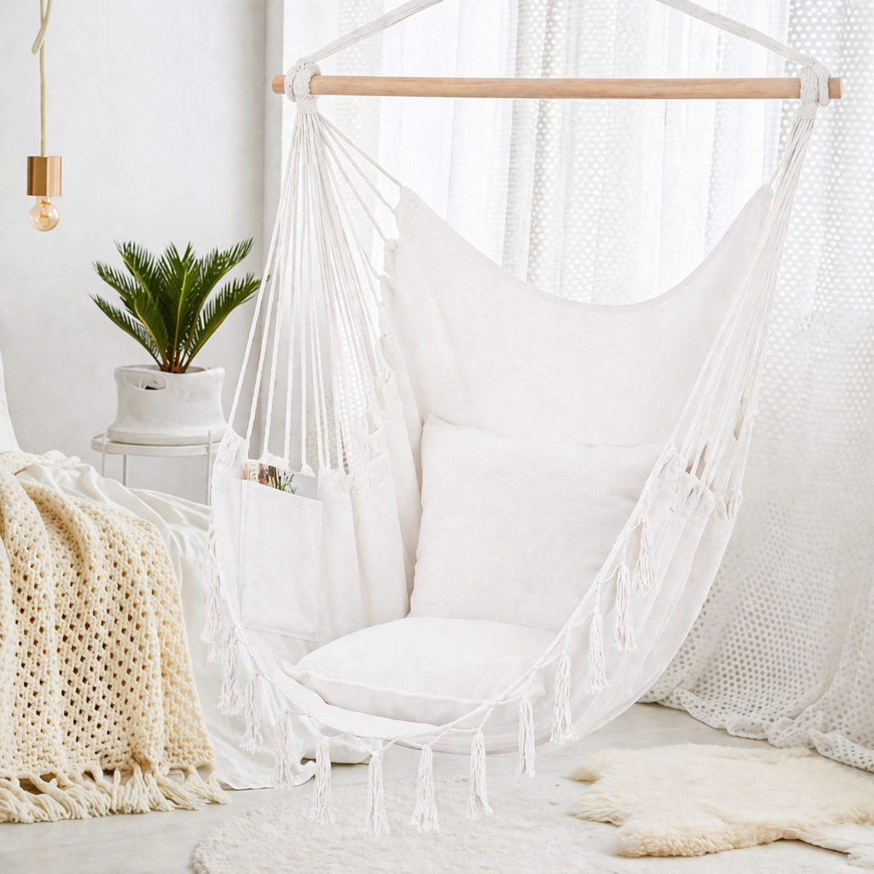 Подвесное кресло-гамак – это сочетание комфорта, прочности и выразительного boho-дизайна. Оно создано для тех, кто ценит уют, эстетику и настоящий релакс как дома, так и на свежем воздухе. Благодаря компактным размерам кресло не требует много места и отлично подойдет для гостиной, спальни, балкона, террасы или сада. Оригинальное плетение с декоративной бахромой подчеркивает современный интерьер и придает простору легкости и стилю.