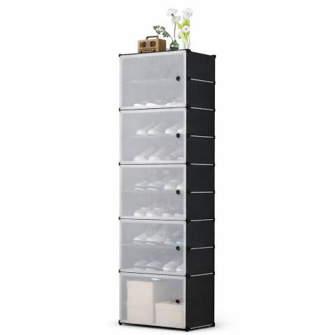 Прозрачные дверцы позволяют легко видеть содержимое, а закрытый формат защищает обувь от пыли и влаги.