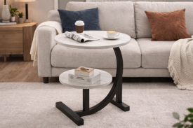 В гостиной в качестве компактного кофейного столика или подставки для напитков.