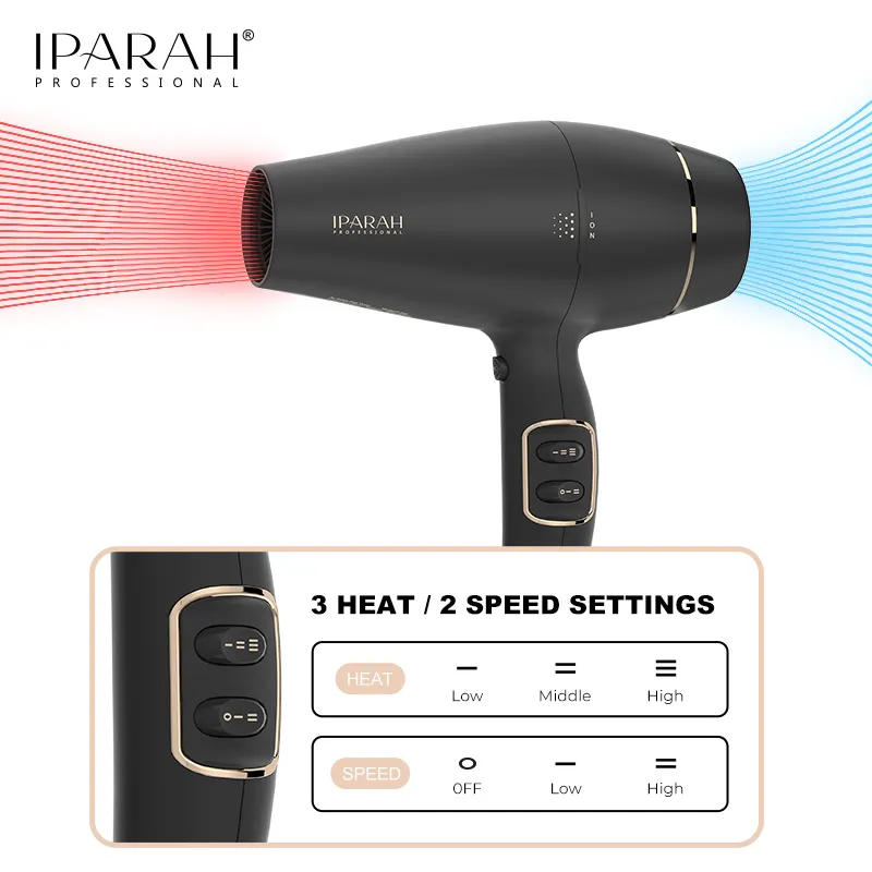 Высокая Производительность: фен IPARAH P-350 может похвастаться мощным двигателем мощностью 1800-2200 Вт, что делает его идеальным для профессионального использования в салонах, домашнем хозяйстве и отелях. Эта мощная производительность обеспечивает быструю и эффективную сушку волос.