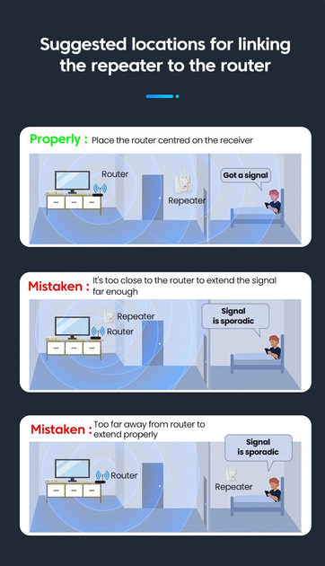 О: Оптимальное размещение ретранслятора – между маршрутизатором и желаемым местом расширения, что эквивалентно размещению его посередине и приему сигналов перед передачей его в нужное место. Конкретное размещение зависит от фактической ситуации использования.