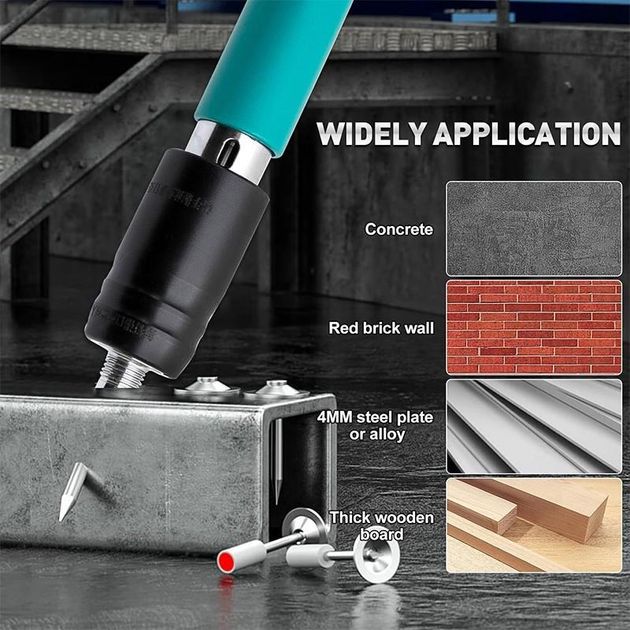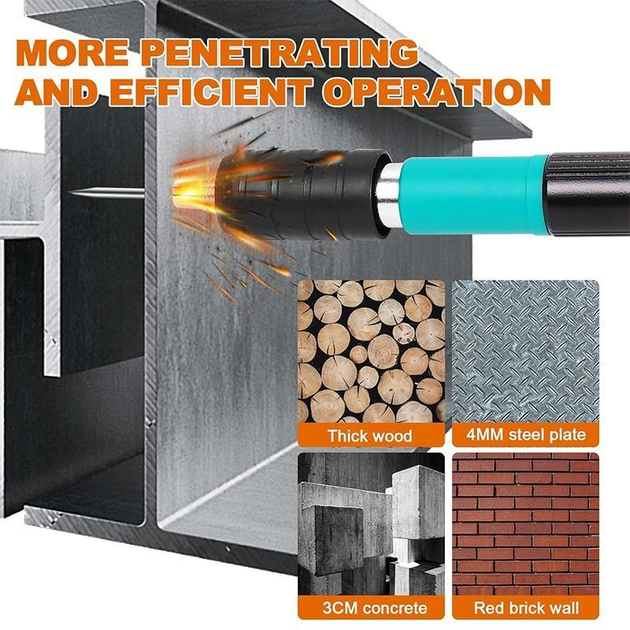 Универсальность: подходит для использования в различных сценариях, таких как работа со сталью, бетоном и деревом. Гвозди могут пробивать стальные пластины толщиной до 3 мм за 0,1 секунды.