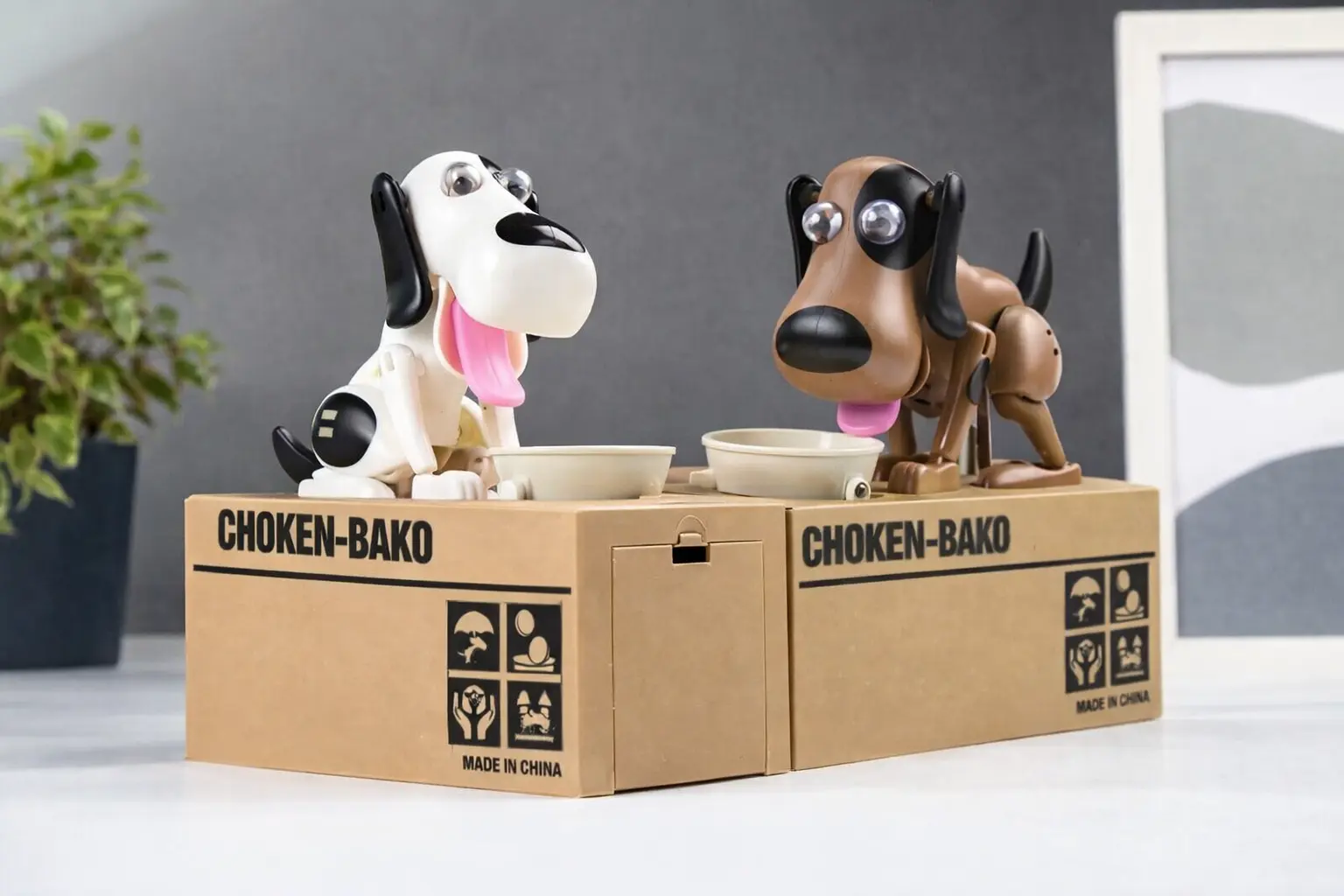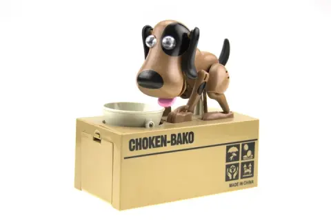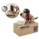 Собачка так активно машет ушками и поедает свой обед, что становится страшно — куда же делась монетка? Пёс помог ей проскользнуть сквозь узкую щель внутрь коробки, теперь ваши сбережения в безопасности. Он так натурально изображает прием пищи, что хочется снова и снова подкладывать ему монетку.
