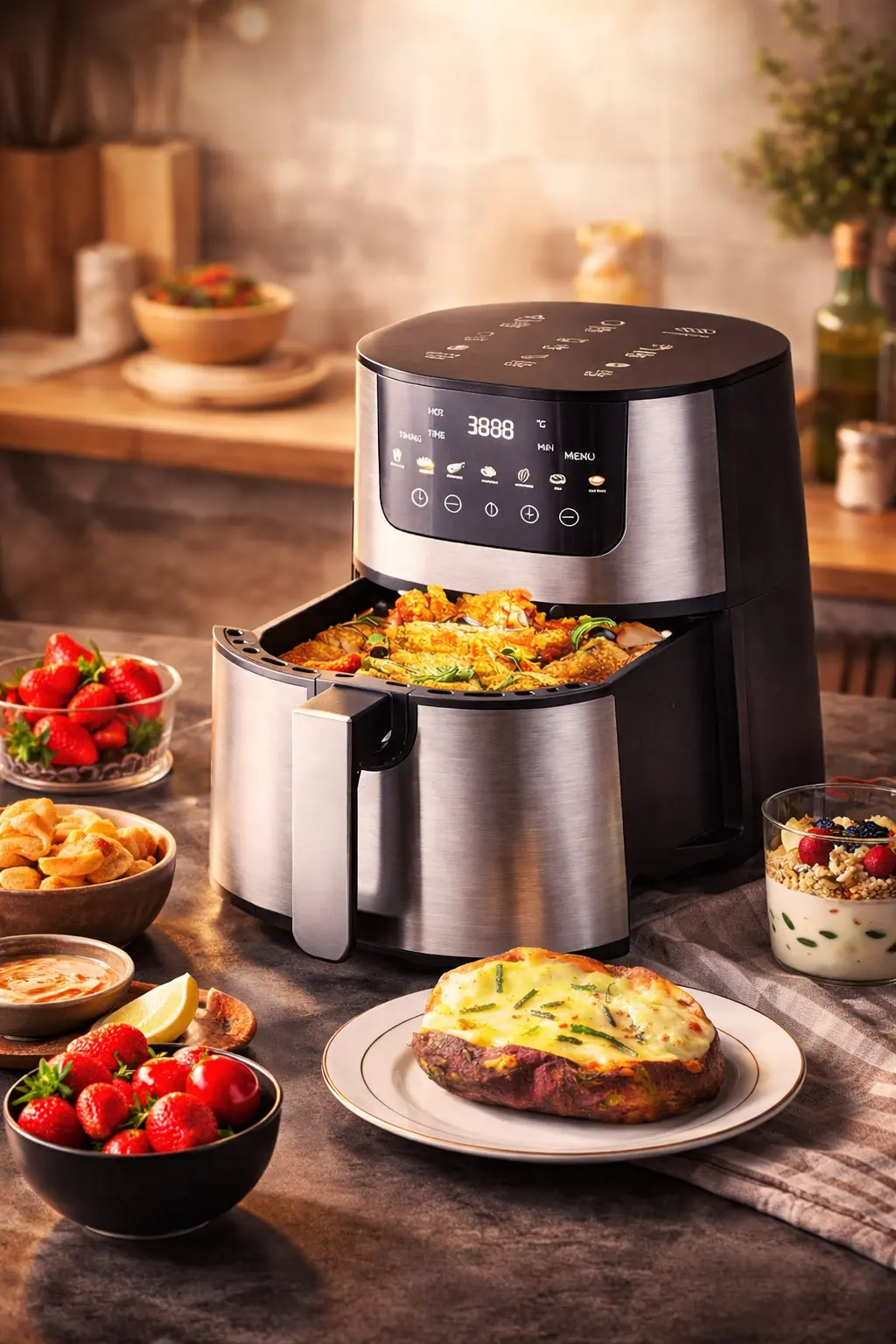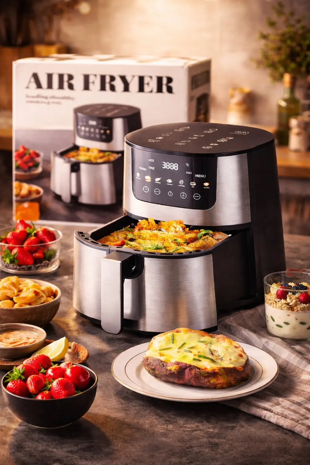 Умная сенсорная панель управления обеспечивает легкую настройку температуры, времени приготовления и выбора автоматических программ для различных блюд. Этот электрический аэрогриль оснащен технологией циркуляции горячего воздуха на 360°, что гарантирует равномерное прожаривание без пересушивания продуктов. Антипригарное покрытие чаши облегчает уход за устройством, а стильный дизайн дополнит любую кухню.
