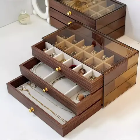 Шкатулка-органайзер для украшений с тремя выдвижными ящиками предназначена для аккуратного хранения колец, сережек, браслетов, часов и других аксессуаров. Внутренняя организация включает роллы для колец, маленькие ячейки для маленьких украшений и просторный отсек для огромных изделий. Прозрачная крышка защищает содержание от пыли и позволяет видеть все украшения без необходимости открывать органайзер.
