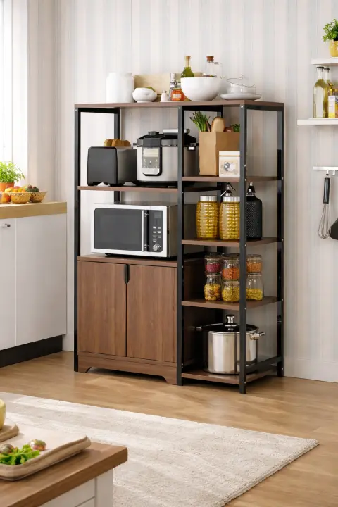 Функциональный кухонный стеллаж — идеальное решение для организации техники, посуды и продуктов. Совмещает открытые полки и закрытый шкаф, позволяя удобно хранить всё необходимое и поддерживать порядок на кухне.