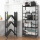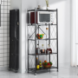 Расстояние между полками позволяет хранить на стеллаже как мелкие аксессуары (банки, контейнеры, книги и др.), так и небольшую технику (например, микроволновку или комбайн), а ограждения с двух сторон, предотвращают падение хранящихся на полке предметов.