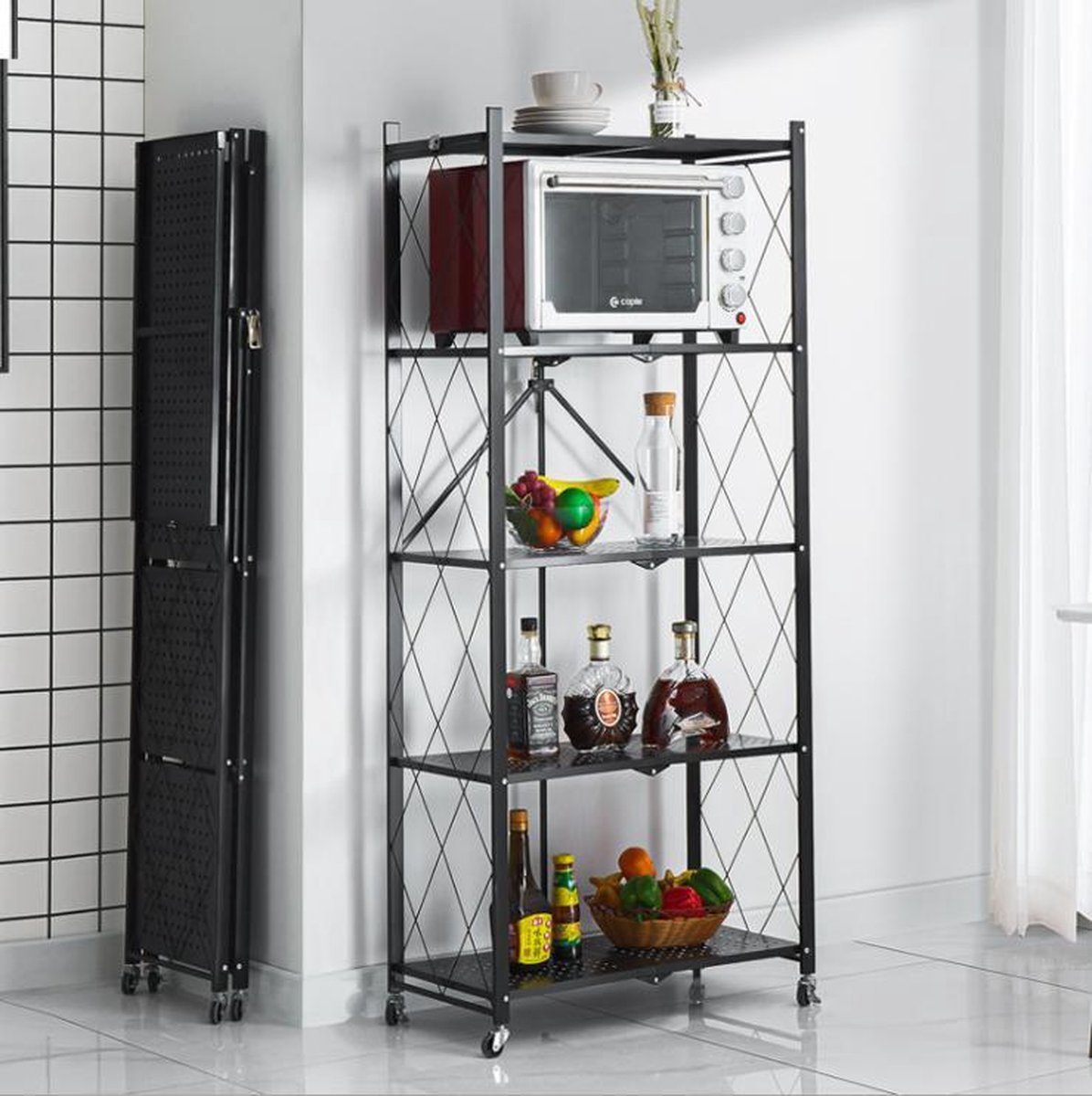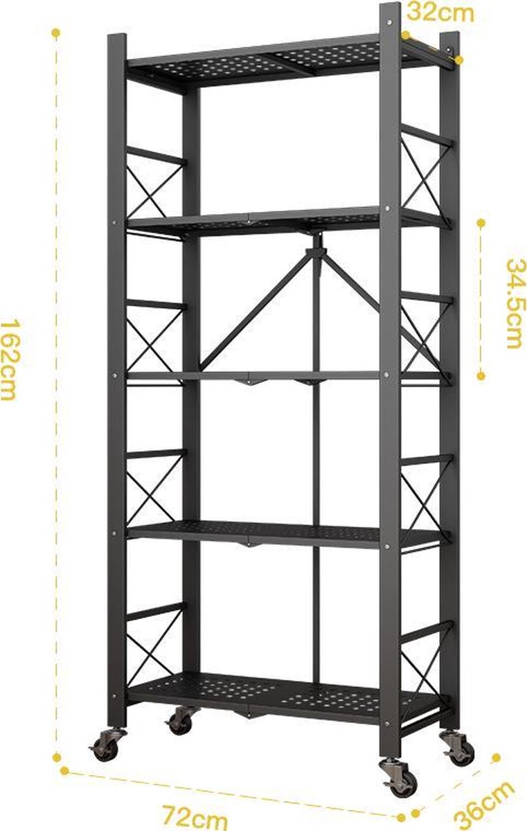 Складной стеллаж оснащен четырьмя пластиковыми колесами с металлическим основанием, которые позволяют легко перемещать его. Также два колеса имеют функцию блокировки, что позволяет надежно зафиксировать стеллаж в выбранном положении.
