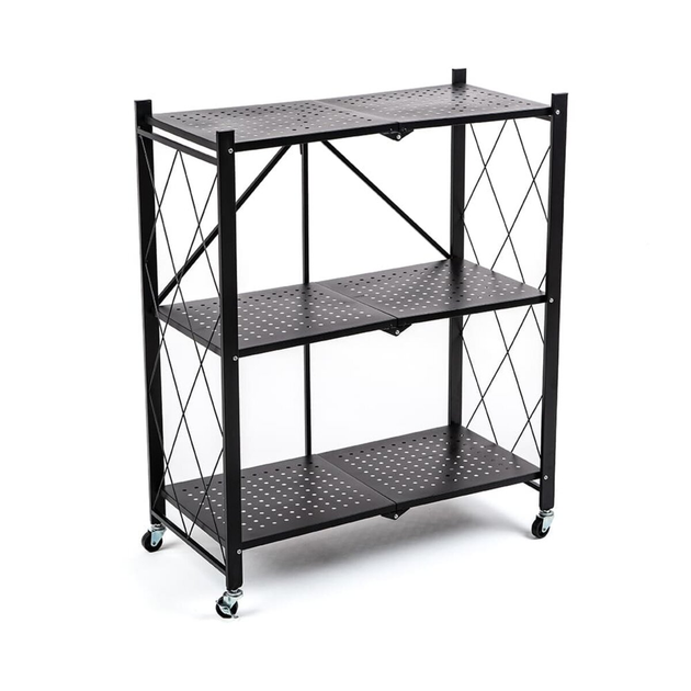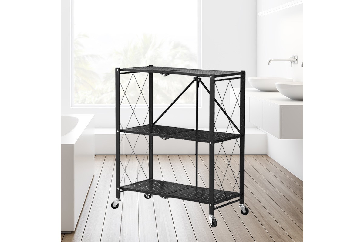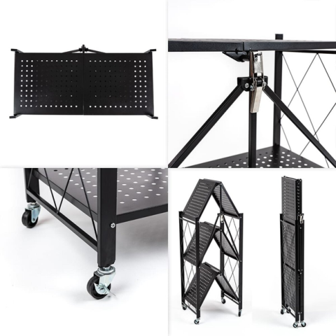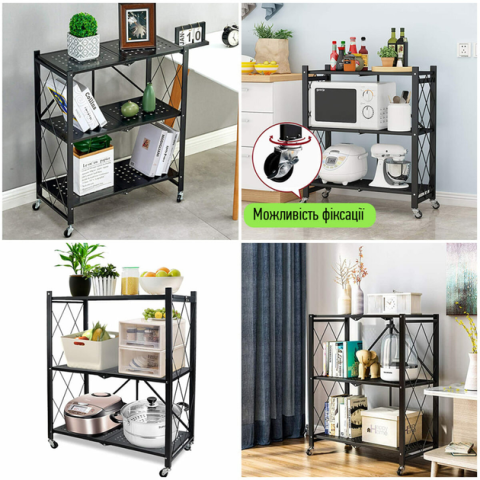 Складной стеллаж оснащен четырьмя пластиковыми колесами с металлическим основанием, которые позволяют легко перемещать его. Также два колеса имеют функцию блокировки, что позволяет надежно зафиксировать стеллаж в выбранном положении.
