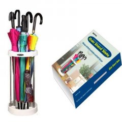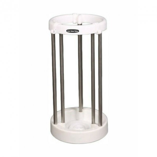 Подставка для зонтов представляет собой напольную стойку для размещения зонтов-тростей. Вся конструкция сделана из прочного аллюмиева прута и надежного пластика. На такой подставке одновременно можно поместить до 10 зонтов. Также есть резервуар для воды.