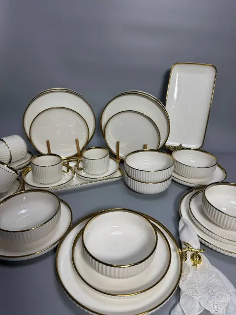 Столовый набор тарелок и чашек RG6804 Gold – это изысканное решение для тех, кто ценит элегантность и качество в повседневной жизни. Этот фарфоровый сервиз на 6 персон, состоящий из 32 предметов, станет идеальным дополнением к вашему столу, подчеркивая стиль и вкус в любой обстановке.