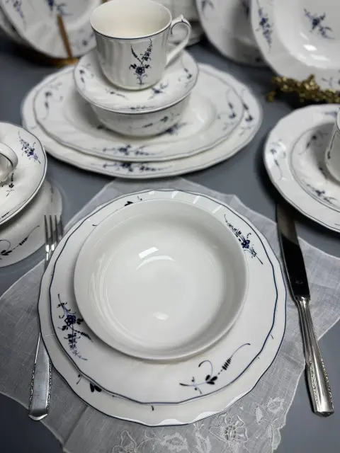 Столовый сервиз RG 1118 – это гармоничное сочетание свежести, элегантности и классического стиля. Чистый белый фарфор подчеркнут нежным голубым декором, что придает посуде легкость и изысканность. Такой сервиз идеально подходит как для праздничной сервировки, так и для ежедневного использования, придавая столу чувство уюта и утонченного вкуса.