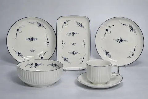 Столовый сервиз RG 1123 — изящный белый фарфор дополнен тонкой синей кромкой и легкими голубыми узорами, придающими посуде особую нежность и шарм. Дизайн смотрится воздушно, свежо и очень аккуратно – без лишней яркости, но с характером.