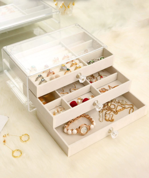 Шкатулка-органайзер для украшений с тремя выдвижными ящиками предназначена для аккуратного хранения колец, сережек, браслетов, часов и других аксессуаров. Внутренняя организация включает роллы для колец, маленькие ячейки для маленьких украшений и просторный отсек для огромных изделий. Прозрачная крышка защищает содержание от пыли и позволяет видеть все украшения без необходимости открывать органайзер.