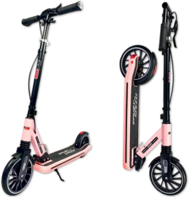 Основной блок изготовлен из легкого и крепкого алюминиевого корпуса. Поверхность деки имеет нескользящее покрытие для безопасного и комфортного скольжения. Этот самокат удобен в перемещении благодаря большой деке, устойчивой даже для людей большого телосложения и резиновому покрытию, легко держать даже взрослым.