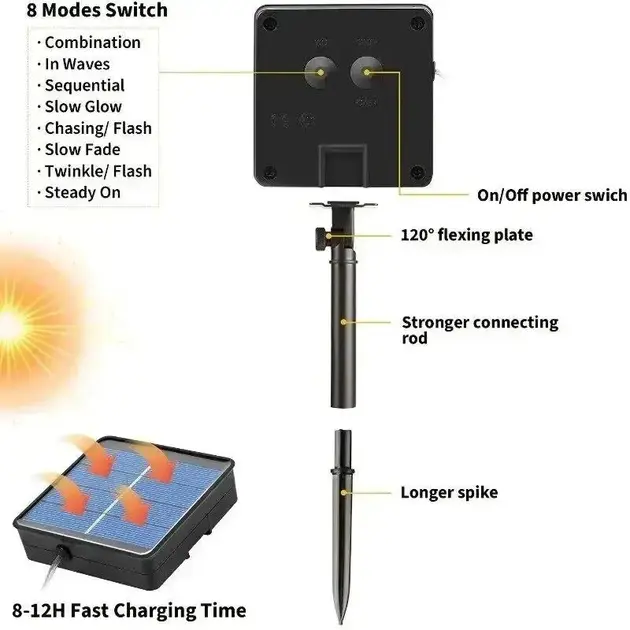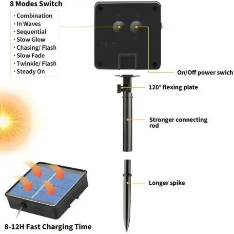 Благодаря солнечной панели, гирлянда заряжается в течение дня и автоматически включается в сумерках, создавая атмосферу уюта и сказочности. Она проста в установке и обладает высоким уровнем защиты от солнечного воздействия, что делает ее идеальной для длительного использования на улице.