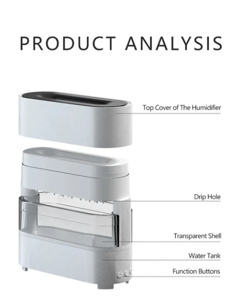Белый шум способствует быстрому засыпанию, а добавление эфирных масел поможет создать приятную ароматерапевтическую атмосферу. Пламя может изменять цвета (белый, красный, желтый, зеленый, голубой, синий, фиолетовый и цветной) и создает расслабляющую обстановку. Управление просто, с помощью кнопок можно регулировать режимы распыления, освещения и капель дождя.
