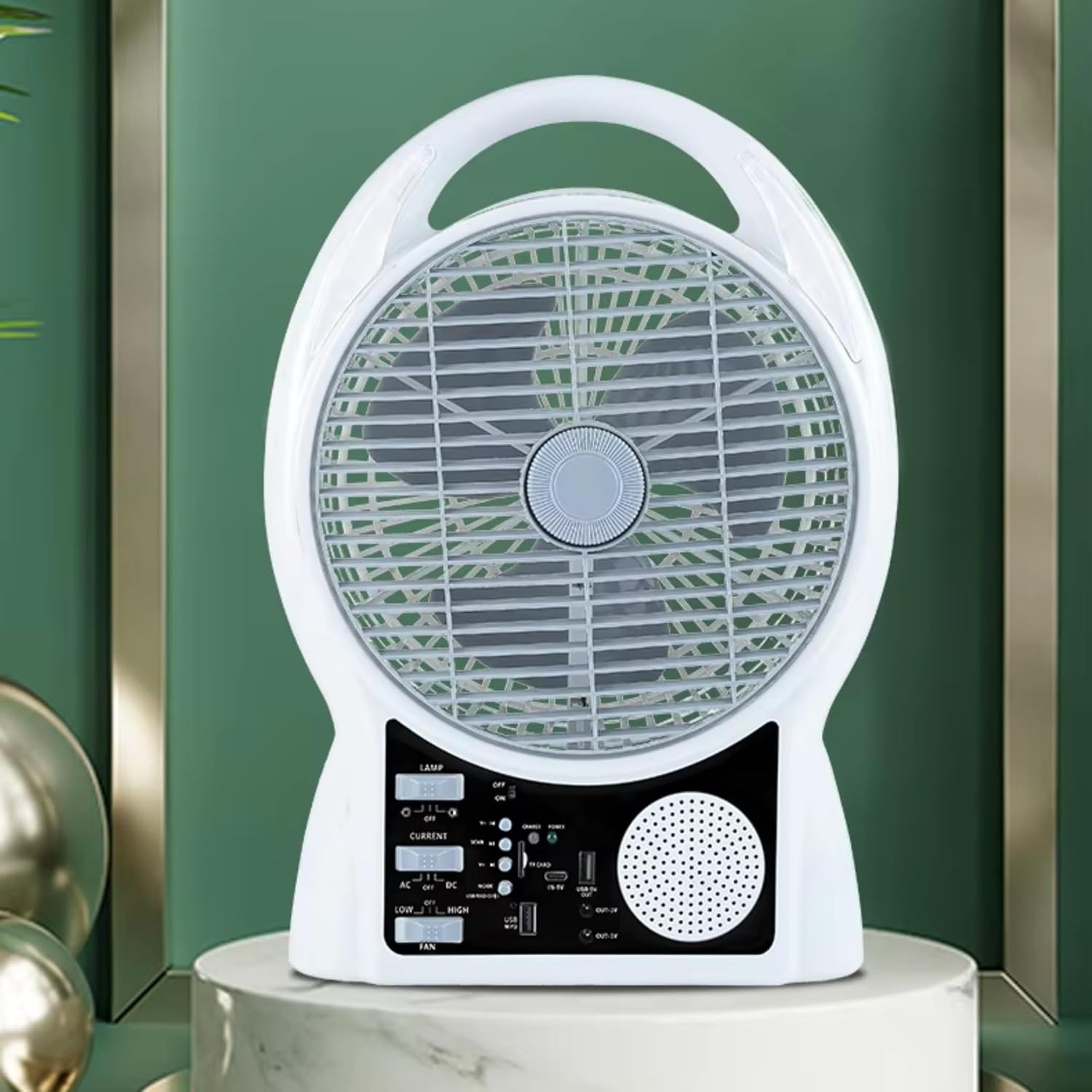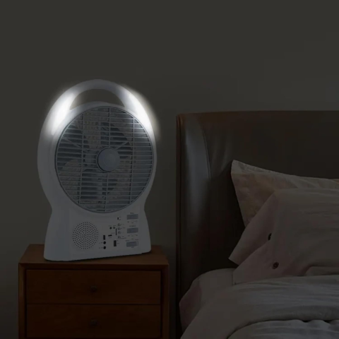 Устройство сочетает в себе настольный вентилятор, мощную LED-подсветку, Bluetooth-колонку, радио и функцию powerbank. Белый пластиковый корпус с лаконичным дизайном и удобная панель управления с кнопками делают простой в использовании. Вы сможете не только освежиться, но и слушать музыку, заряжать телефон и освещать при необходимости.