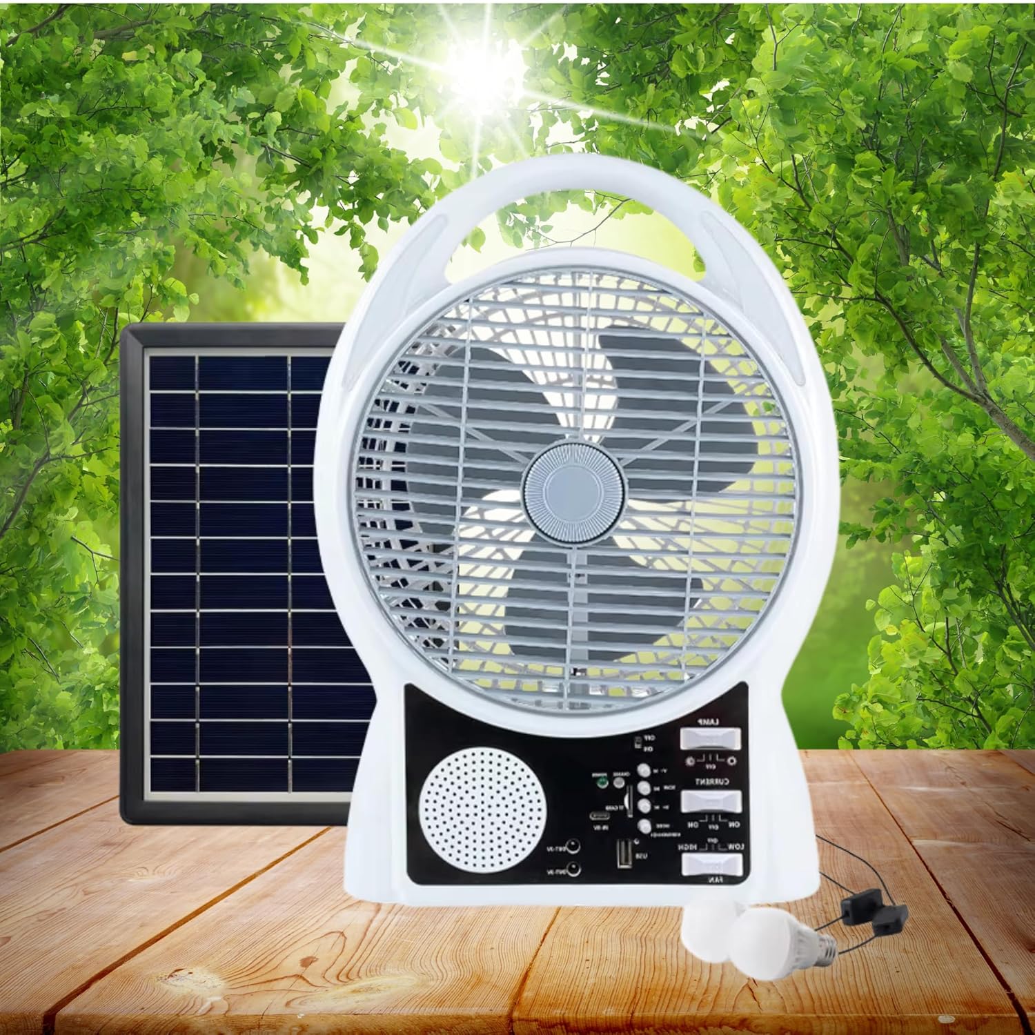 Вентилятор портативный Solar с USB, Bluetooth, MP3, FM-радио / Аккумуляторный вентилятор с LED подсветкой, 2 скорости, 6Вт 5500 мАч