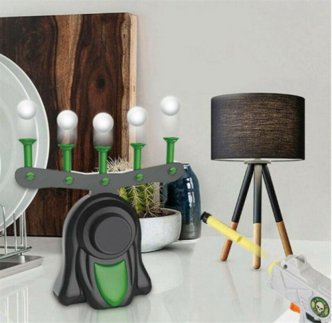 Но веселье на этом еще не заканчивается. Возьмите пистолет и вставьте в него один из пяти включенных пенных дротиков. Потяните петлю к себе, чтобы взвести ее, прицельтесь , сделайте глубокий вдох и ... ОГОНЬ ПЛИ!