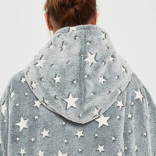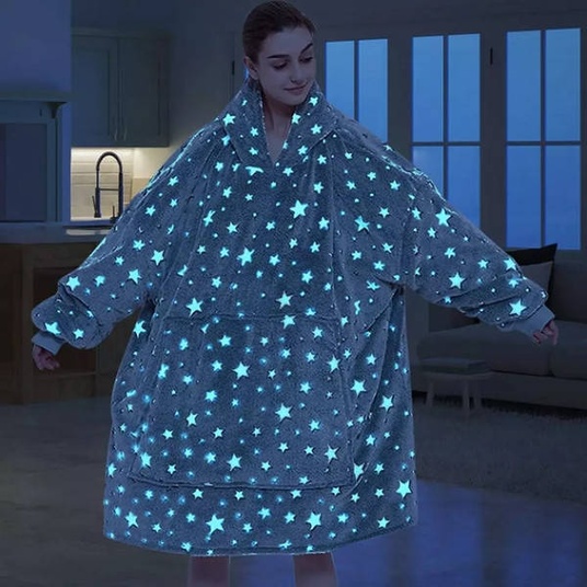 Толстовка с капюшоном – это самый уютный и комфортный костюм с капюшоном, сочетающий в себе большую толстовку и теплую ковдру. Толстовка-плед сшитая из ультрамягкого флиса, имеет один большой размер, чтобы максимально укрыть с головы до ног. В толстовке есть одна вместительная карман, чтобы держать под рукой все необходимое. Ее размер только один, и он очень велик. Возьмите ее с собой в поход или просто расслабьтесь дома за просмотром любимых фильмов – она идеально подойдет как для одного, так и для другого. Но самой главной особенностью этой кофты являются светящиеся на кофте звездочки. Они светятся благодаря вышивке специальными нитями. Вот света ткань накапливает свет и в темноте начинает светиться. Толстовка с капюшоном станет комфортным и приятным городком для зимних дней. Порадуйте себя и своих близких таким приятным подарком.