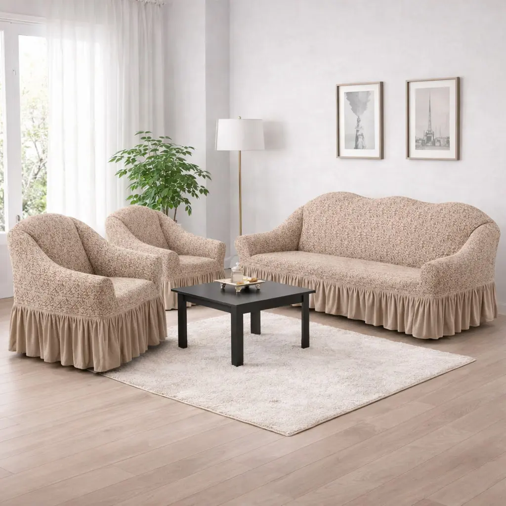 Жаккардовый турецкий чехол на диван и два кресла, универсальный натяжной чехол, накидка на диван Бежевый