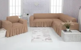Чехол накидка на угловой диван с креслом, комплект чехлов на угловой диван и кресло с оборкой Турция