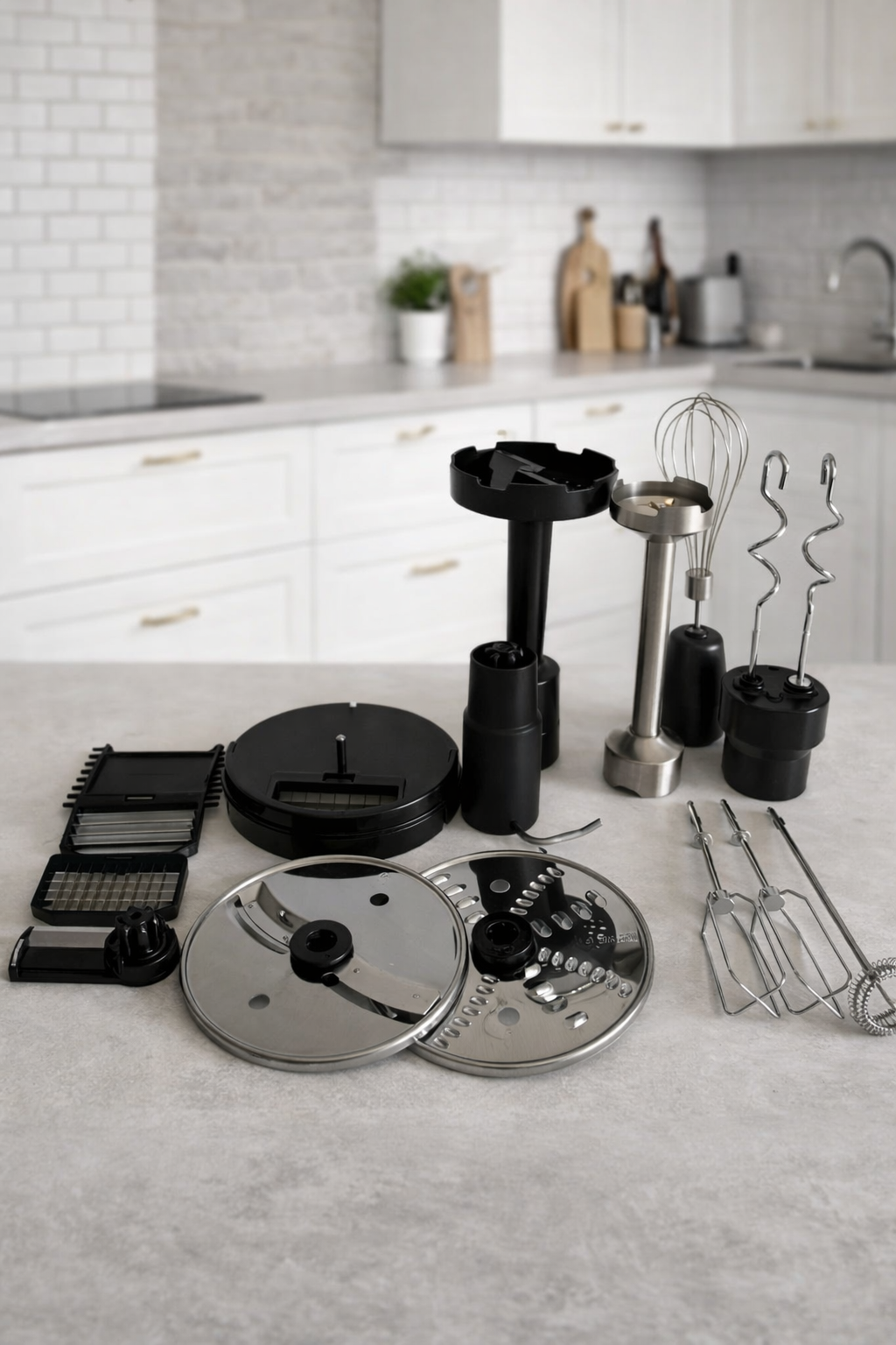 Конструкція має на увазі використання різних насадок для виконання окремих функцій. У комплект входять віночки, гачки для тесту, насадки для нарізки та шатківниці, а також додаткові елементи для обробки продуктів. Для роботи з інгредієнтами передбачені окремі ємності: чаша кухонного комбайна об'ємом 1500 мл, чаша подрібнювача на 600 мл і мірна склянка на 800 мл.