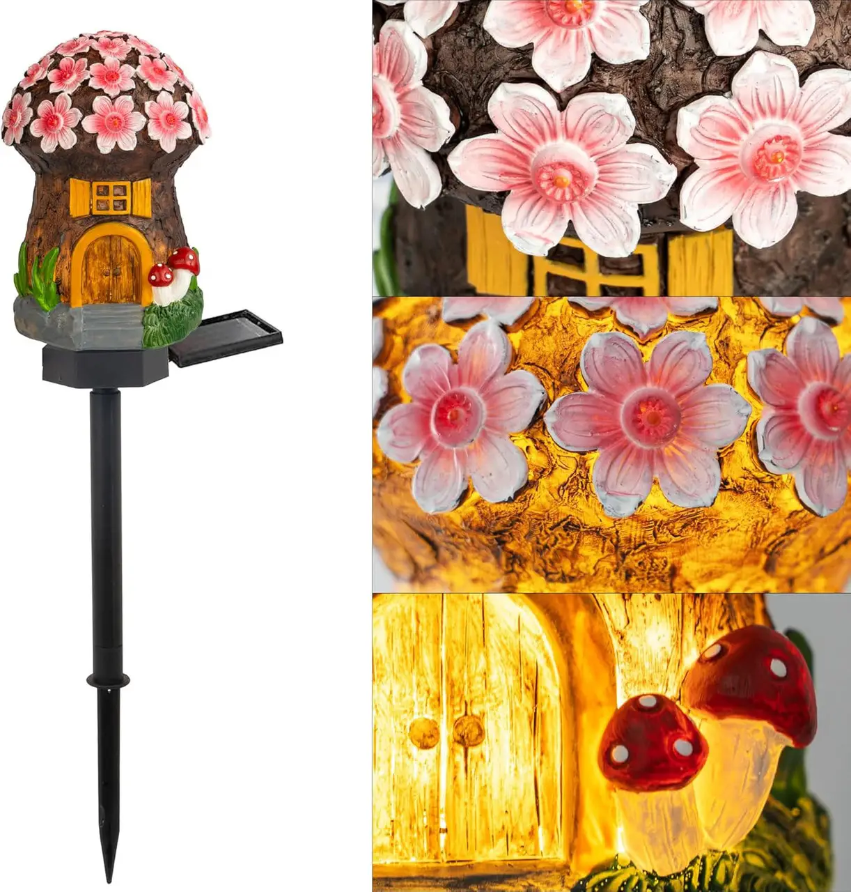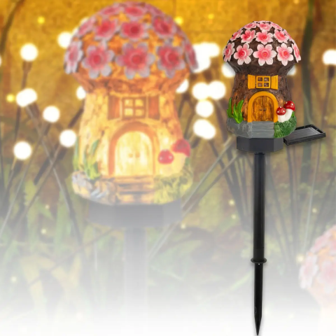 Чарівний світильник у вигляді грибного будиночка стане незвичайною окрасою вашої ділянки. Вдень він тішить око своїм докладним опрацюванням, створюючи атмосферу чарівництва, а вночі випромінює тепле світло, немов усередині справді живуть казкові істоти.