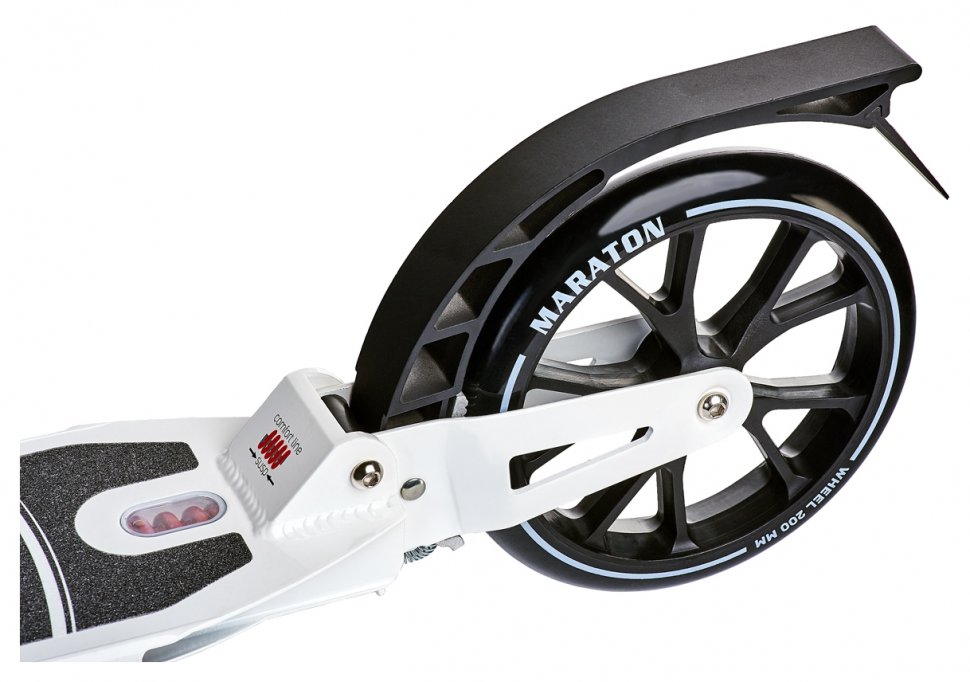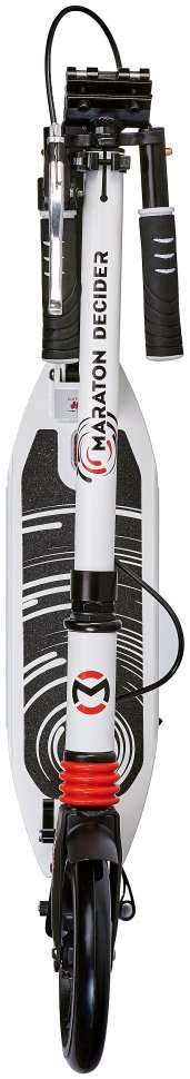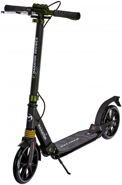 Міський самокат Maraton Decider виконаний у двох кольорах: класичному Білому та у стриманому Чорному з деталями кольору хакі-металік.