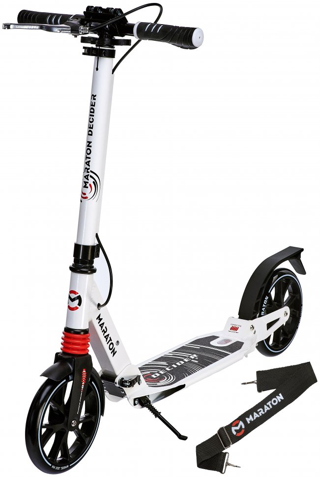 Міський самокат Maraton Decider має легку систему складання, а також ремінь для перенесення, завдяки чому його зручно зберігати та транспортувати.
