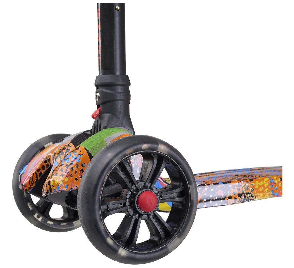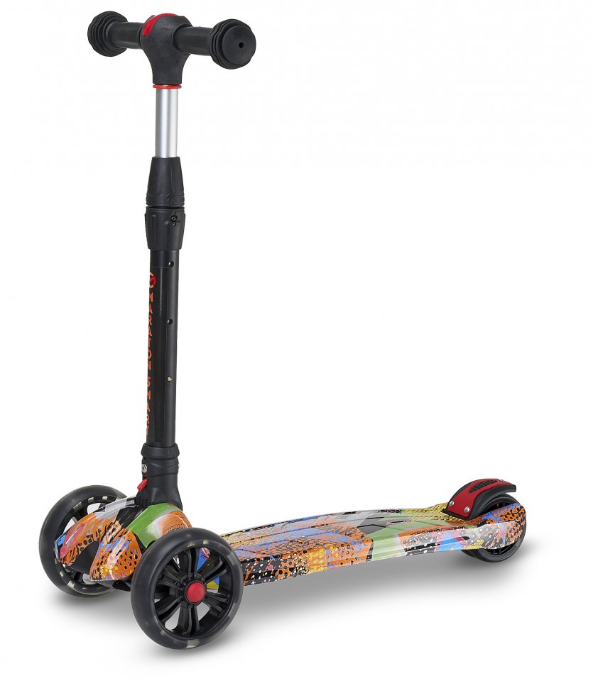 Триколісний дизайн забезпечує максимальну маневреність і дозволяє впоратися з вузькими вулицями та скупченнями людей. Самокат оснащений гальмом на задньому колесі, яке дозволяє контролювати швидкість і забезпечує безпечну зупинку.