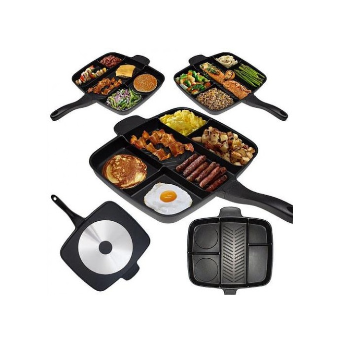 Іноваційна універсальна сковорода Magic Pan – це п'ятисекційний набір, який дозволить приготувати одночасно п'ять різних продуктів. Наприклад, смачний, повноцінний сніданок – ndash; яєчню, сосиски та оладки одночасно. Міцне керамічне антипригарне покриття Xylan не виділяє при нагріванні шкідливих речовин та важких металів. Основа сковорідки оптимально розподіляє тепловий потік: більше в центрі для грилю риби та м'яса, менше з боків для смаження яєць, овочів, млинців і т.д.